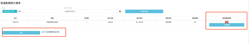 注意:未满足排片指导是无法点击审批审批按键为“禁止状态符号 ” 申请调整审批完成后方可点击“ 审批 ”按钮