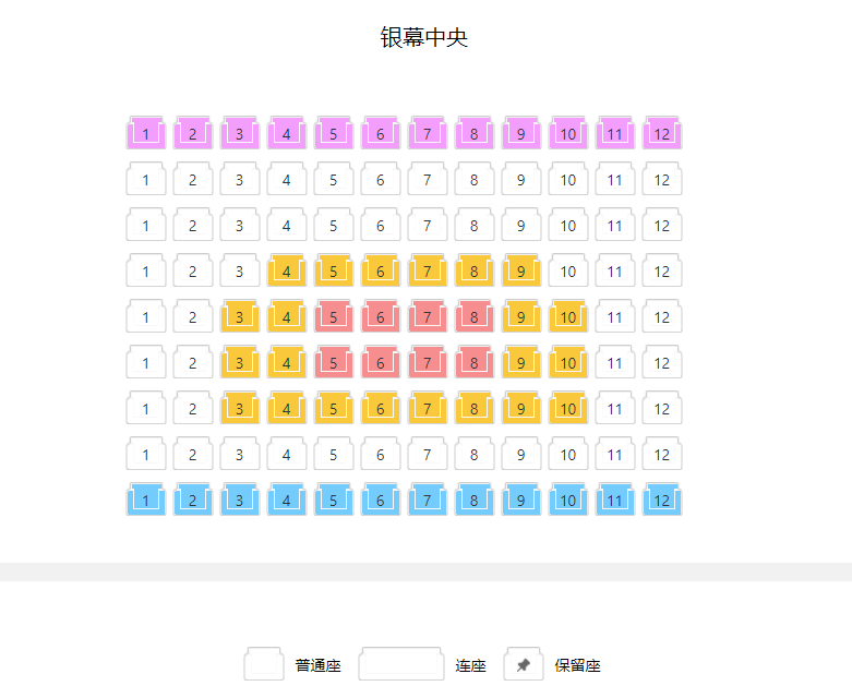 分区管理操作方式:所有白色座位均为默认区,先点击右上角的某个分区颜色,然后在座位图上点选或框选要划入该区的座位,不同的区的座位显示不同的颜色。