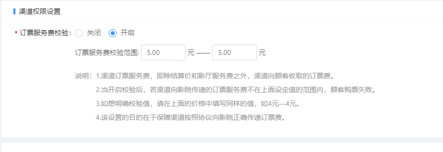 1.固定服务费:注意单位是分,固定服务费意味着匹配到的场次收取固定金额,那么最终网售接口价(不含第三方订票费)=结算价+固定服务费,并且该选项限制了固定服务费的最大值为结算价百分比